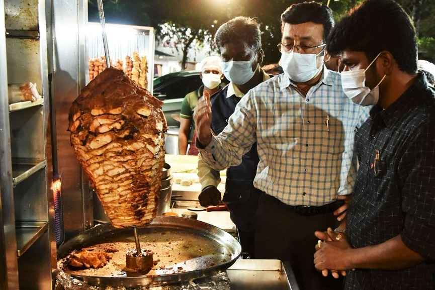 ഇന്ന് 485 സ്ഥാപനങ്ങളില് ഭക്ഷ്യ സുരക്ഷാ വകുപ്പ് ‘ഷവർമ പ്രത്യേക പരിശോധന’ നടത്തിയതായി ആരോഗ്യ വകുപ്പ് മന്ത്രി വീണാ ജോര്ജ് അറിയിച്ചു. വൃത്തിഹീനമായി പ്രവര്ത്തിച്ച 10 സ്ഥാപനങ്ങളുടേയും ലൈസന്സ് ഇല്ലാതിരുന്ന 6 സ്ഥാപനങ്ങളുടേയും ഉള്പ്പെടെ 16 ഷവർമ കടകളാണ് ഇന്ന് പൂട്ടിച്ചത്. 162 സ്ഥാപനങ്ങള്ക്ക് നോട്ടീസ് നല്കിയതായും മന്ത്രിയുടെ ഓഫീസ് അറിയിച്ചു.