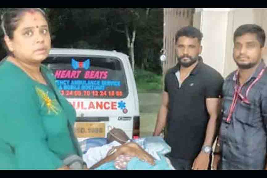 ബെംഗളൂരു സ്വദേശിയെ ആംബുലൻസിൽ കയറ്റാനൊരുങ്ങുന്ന സജിത്തും മനുവും