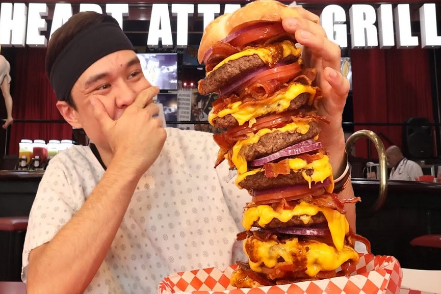 ലാസ് വേഗസിലെ ഹാർട്ട് അറ്റാക് ഗ്രിൽ നടത്തിയ തീറ്റ മൽസരത്തിൽ ആയിരുന്നു മാറ്റ് സ്റ്റോണിയുടെ ഈ തകർപ്പൻ പ്രകടനം. 2.94 കിലോഗ്രാം ഭാരം വരുന്ന ബർഗറിൽ 40 സ്ളൈസ് ബേക്കണും 8.5 പാറ്റികളും 16 സ്ളൈസ് ചീസും ഒരു വലിയ സവാളയും രണ്ട് തക്കാളിയും മുളകും ബണ്ണുകളുമാണ് ഉൾപ്പെടുന്നത്.