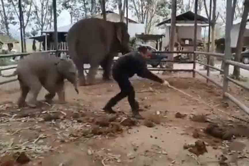 ഒരു മൃഗശാലയിൽ നിന്നുള്ള ആനക്കുട്ടിയുടെ രസകരമായ വീഡിയോ ഇപ്പോൾ സോഷ്യൽ മീഡിയയിൽ വൈറലായിട്ടുണ്ട്. ഐഎഫ്എസ് ഉദ്യോഗസ്ഥനായ സുശാന്ത നന്ദയാണ് വീഡിയോ ട്വിറ്ററിൽ പങ്കുവച്ചിരിക്കുന്നത്. ആനയെയും ആനക്കുട്ടിയെയും പാർപ്പിച്ച ഇടം വൃത്തിയാക്കാൻ എത്തിയ ജീവനക്കാരനുമായി കളിക്കുകയാണ് ആനക്കുട്ടി.ആനപ്പിണ്ടം നീക്കി വൃത്തിയാക്കുന്നതിനിടെ ആനക്കുട്ടി ഓടിവന്ന് മസ്തകം കൊണ്ട് ജീവനക്കാരനെ ഇടിച്ചു കളിക്കുന്നതാണ് വീഡിയോയിൽ ഉള്ളത്. ജീവനക്കാരൻ അതിനെ ചെറു പുഞ്ചിരിയോടെ ആസ്വദിക്കുന്നുമുണ്ട്. എന്നാൽ കുട്ടിക്കുറുമ്പന്റെ കുറുമ്പൊന്നും ശ്രദ്ധിക്കാതെ ഒരു വശത്ത് ഒതുങ്ങി നിൽക്കുകയാണ് ആന.