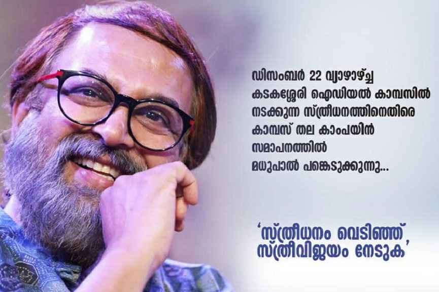 മലപ്പുറം: ജില്ലയിലെ പൊന്നാനിയിൽ നാളെ നടക്കുന്ന സ്ത്രീധന വിരുദ്ധ കാംപയിൻ സമാപന സമ്മേളനത്തിൽ സംവിധായകനും നടനും എഴുത്തുകാരനും സംസ്ഥാന സാംസ്കാരിക പ്രവർത്തക ക്ഷേമനിധി ബോർഡ് ചെയർമാനുമായ മധുപാൽ പങ്കെടുക്കും.
