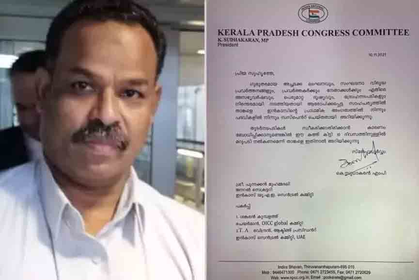 തുടര്നടപടികള് സ്വീകരിക്കാതെ ഇരിക്കണമെങ്കിൽ കാരണം കാണിച്ച് 10 ദിവസത്തിനുള്ളില് മറുപടി നല്കണമെന്നും കെപിസിസി അധ്യക്ഷന്റെ കത്തില് വ്യക്തമാക്കുന്നു. യുഎഇ ഇന്കാസ് കമ്മിറ്റിയില് വിഭാഗീയത രൂക്ഷമാകുന്നതിനിടെയാണ് മുതിര്ന്ന നേതാവിനെതിരെ അച്ചടക നടപടി ഉണ്ടാകുന്നത്.