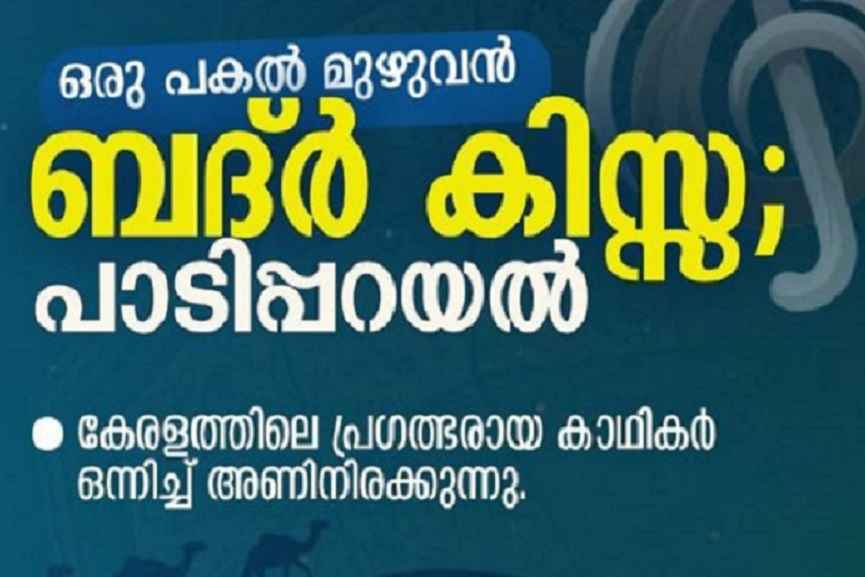 മലപ്പുറം: ഓള്‍ കേരള കിസ്സപ്പാട്ട് അസോസിയേഷന്റെയും മഅ്ദിന്‍ അക്കാദമിയുടെയും സംയുക്‌ത ആഭിമുഖ്യത്തിൽ ഒരുപകൽ മുഴുവൻ നീണ്ടുനിൽക്കുന്ന ‘ബദ്‌ർ കിസ്സപ്പാട്ട്’ മഅ്ദിന്‍ കാമ്പസിൽ ഏപ്രിൽ 14ന് വ്യാഴാഴ്‌ച നടക്കും.