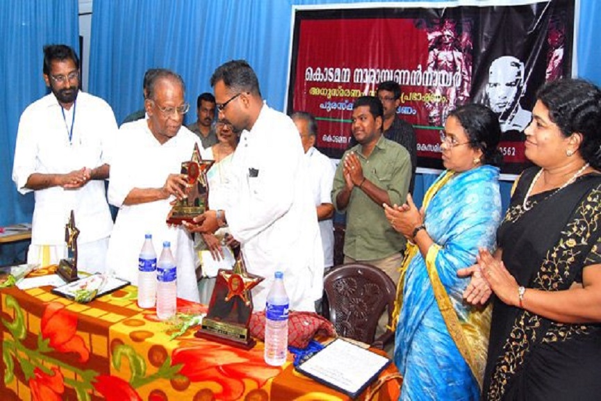 മാദ്ധ്യമ രംഗത്തെ 2009ലെ കെഎന്‍എന്‍ പുരസ്‌കാരം അഴീക്കോട് മാഷിൽ നിന്ന് ‘ഇഎം’ സ്വീകരിക്കുന്നു. ഒപ്പം സഹ അവാർഡ് ജേതാക്കളായ കെപി സുധീര, ബാബു പാലിശ്ശേരി എംഎല്‍എ എന്നിവരും