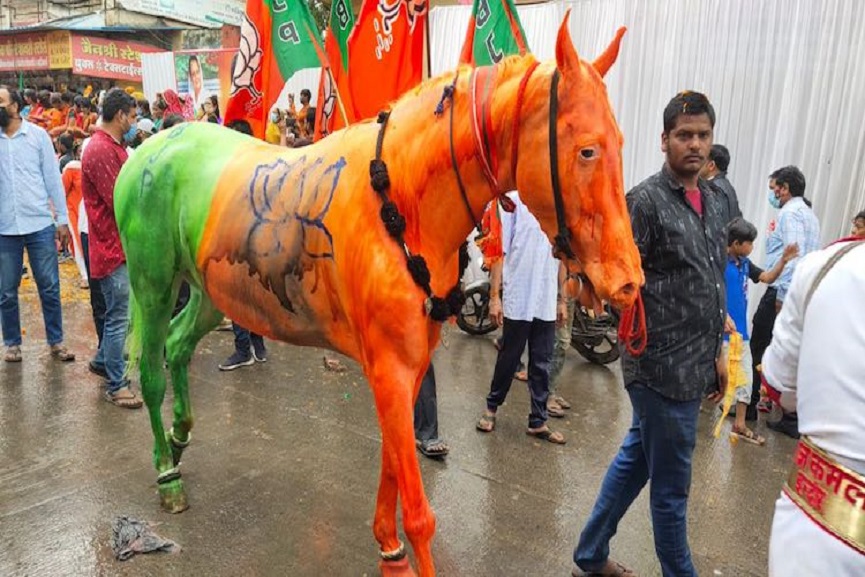മുന് മുനിസിപ്പല് കോര്പ്പറേറ്റര് രാംദാസ് ഗാര്ഗാണ് യാത്രക്ക് മുന്നോടിയായി കുതിരയെ വാടകക്കെടുത്ത് ബിജെപി പതാകയുടെ പെയിന്റടിച്ചത്. ബിജെപി എംപി മേനകാ ഗാന്ധിയുടെ സംഘടനയായ പിഫ്എയുടെ പരാതി പ്രകാരം മൃഗങ്ങളോടുള്ള ക്രൂരത തടയുന്ന 1960 നിയമപ്രകാരമാണ് എഫ്ഐആർ രജിസ്റ്റർ ചെയ്തിരിക്കുന്നത്.