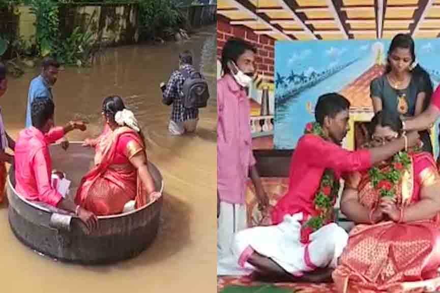 നീന്തിയോ തോണിയിൽ കയറിയോ മാത്രം യാത്ര സാധ്യമായിരുന്ന ദിവസം. അതേ ദിവസം തന്നെയാണ് അമ്പലപ്പുഴ സ്വദേശിനി ഐശ്വര്യയും തകഴി സ്വദേശി ആകാശും തമ്മിലുള്ള വിവാഹവും. മുഹൂർത്തത്തിന് മുൻപ് ഈ വെള്ളക്കെട്ട് ഇല്ലാതാവില്ലെന്ന് ഉറപ്പാണ്. അതോടെ ഐശ്വര്യയും ആകാശും മറ്റൊന്നും ആലോചിച്ചില്ല. ഇരുവരും ഒരു ചെമ്പിൽ കയറി ഇരുന്നു.