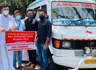 ബേപ്പൂരിലെ കോവിഡ് പ്രതിരോധത്തിന് ഓക്സിജൻ ആംബുലൻസ് സമ്മാനിച്ച് ഫാറൂഖ് കോളേജിലെ പൂര്വ വിദ്യാർഥികൾ