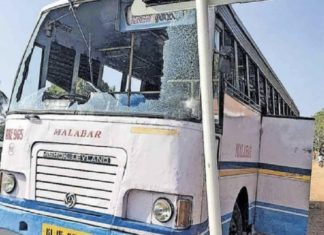ഓടിക്കൊണ്ടിരുന്ന ബസിന്റെ ചില്ല് തകർന്നു; മൂന്ന് പേർക്ക് പരിക്ക്