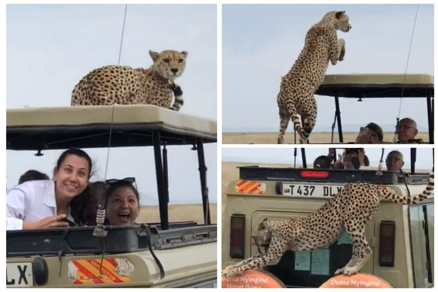 ടാൻസാനിയയിലെ സെരെൻഗറ്റി നാഷണൽ പാർക്കിലാണ് സംഭവം നടന്നത്. സഫാരിക്കിടെ വാഹനത്തിലേക്ക് ഒട്ടും പ്രതീക്ഷിക്കാതെ ഒരു ചീറ്റപ്പുലി ചാടിക്കയറുകയായിരുന്നു. വാഹനത്തിന്റെ പുറകിൽ പുലിയെ കണ്ട് ആദ്യം ആളുകൾ എന്ത് ചെയ്യണമെന്ന് അറിയാതെ അമ്പരന്നു. പക്ഷേ, പുലി വളരെ കൂൾ ആയിരുന്നു. മനുഷ്യരുമായി ഇണങ്ങിയ ചീറ്റപ്പുലിയായിരുന്നു ഇത്. അതിനാൽ തന്നെ ചാടിക്കയറിയ വാഹനത്തിൽ ആളുകളെ കണ്ടിട്ടും കക്ഷിക്ക് വലിയ കുലുക്കമൊന്നും ഉണ്ടായിരുന്നില്ല. ശാന്തനായി വാഹനത്തിന് മുകളിൽ കിടന്നു.