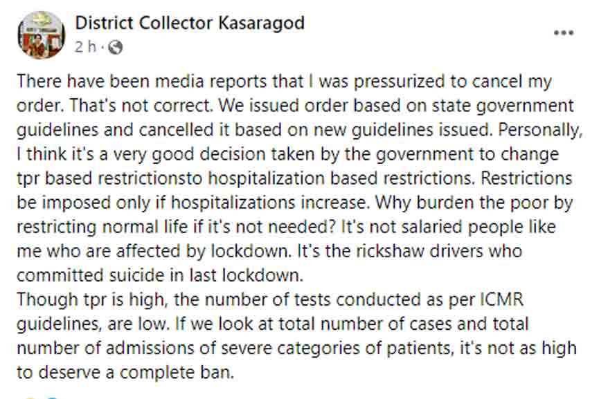 കാസർഗോഡ്: സംസ്ഥാനത്ത് കോവിഡ് നിയന്ത്രണങ്ങൾ കടുപ്പിക്കുന്നതിനിടെ കാസർഗോഡ് ജില്ലയിൽ പൊതുപരിപാടി നിരോധന ഉത്തരവ് പിൻവലിച്ച നടപടി വിവാദമാകുന്ന സാഹചര്യത്തിൽ വിശദീകരണവുമായി കളക്ടർ ഭണ്ഡാരി സ്വാഗത്. പൊതുപരിപാടി നിരോധന ഉത്തരവ് പിൻവലിച്ചത് സമ്മർദ്ദത്തെ തുടർന്നല്ലെന്നും പരിഷ്കരിച്ച പ്രോട്ടോക്കോൾ അനുസരിച്ചാണ് എന്നും കളക്ടർ ഫേസ്ബുക്ക് പേജിലൂടെ നൽകിയ വിശദീകരണത്തിൽ പറയുന്നു.