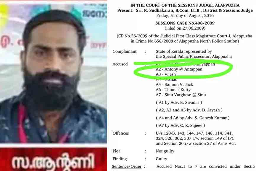 2008ൽ ആലപ്പുഴയിലെ സിപിഐ പ്രവര്‍ത്തകനായിരുന്ന അജു എന്നയാളെ കൊലപ്പെടുത്തിയ കേസിലെ പ്രതി ആന്റണി എന്ന ആന്റപ്പനെയാണ് ആലപ്പുഴ ആര്യാട് ഐക്യഭാരതം മേഖലാ വൈസ് പ്രസിഡണ്ടായി തിരഞ്ഞെടുത്തത്. സിപിഐ പ്രവര്‍ത്തകനായിരുന്ന അജുവിനെ കൊലപ്പെടുത്തിയ കേസില്‍ ആന്റണി ഉള്‍പ്പടെ ഏഴു പ്രതികളാണ് ഉണ്ടായിരുന്നത്.