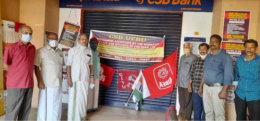 പണിമുടക്കിയ ജീവനക്കാർ സിഎസ്ബി ബാങ്കിന്റെ ജില്ലയിലെ ശാഖകൾക്ക് മുന്നിൽ പ്രതിഷേധ ധർണ നടത്തി. സിഎസ്ബി കാഞ്ഞങ്ങാട് ബ്രാഞ്ചിന് മുന്നിൽ നടന്ന ധർണ സിഐടിയു ജില്ലാ സെക്രട്ടറി കറ്റാടി കുമാരൻ ഉൽഘാടനം ചെയ്തു.