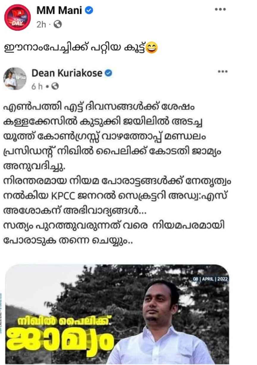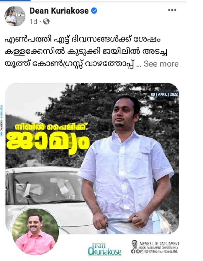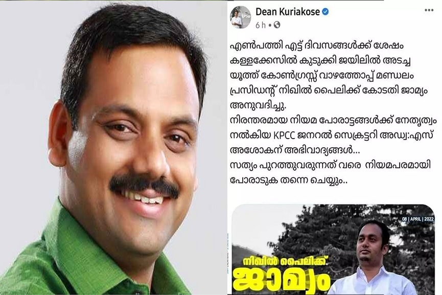 ഫേസ്ബുക്കിൽ പങ്കുവെച്ച കുറിപ്പിലാണ് നിഖില് പൈലിക്ക് ജാമ്യം അനുവദിച്ചതില് ഡീന് ആഹ്ളാദം പ്രകടിപ്പിച്ചത്. പ്രതിക്ക് നിയമ സഹായം നല്കിയ കെപിസിസി ജനറല് സെക്രട്ടറി അഡ്വ. എസ് അശോകന് അഭിവാദ്യങ്ങള് അര്പ്പിക്കുന്നുവെന്നും ഡീന് പോസ്റ്റില് പറഞ്ഞിരുന്നു.