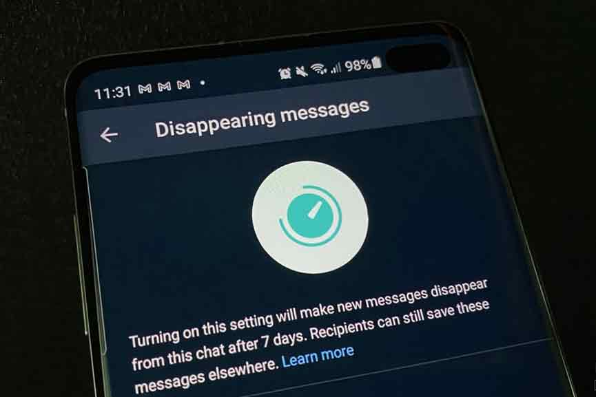 മീഡിയ ഫയലുകള് ഉള്പ്പടെ ഡിലീറ്റ് ചെയ്യാന് ഈ സൗകര്യം ഉപയോഗിക്കാം. ഗ്രൂപ്പില് ഇത് ഓണാക്കിയാല് ഗ്രൂപ്പിലെ എല്ലാ സന്ദേശങ്ങളും 7 ദിവസത്തിന് ശേഷം അപ്രത്യക്ഷമാകും. എന്നാല് വ്യക്തികള്ക്കിടയില് ഇരുപേരും ഇത് ഓണാക്കിയിടണം.