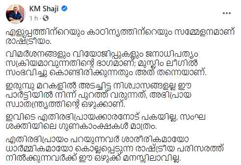 കോഴിക്കോട്: അഭിപ്രായ സ്വാതന്ത്ര്യത്തിന്റെ ഒഴുക്കാണ് മുസ്ലിം ലീഗിൽ നിന്ന് പുറത്തുവരുന്നതെന്ന് കെഎം ഷാജി. എതിരഭിപ്രായം പറയുന്നവർ ശാരീരികമായോ ധാർമികമായോ കൊല്ലപ്പെടുന്ന രാഷ്ട്രീയ പരിസരത്ത് നിൽക്കുന്നവർക്ക് ഈ ഒഴുക്ക് മനസിലാവില്ലെന്നും അദ്ദേഹം ഫേസ്ബുക്കിൽ കുറിച്ചു.