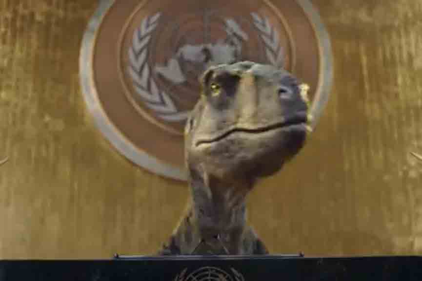അന്താരാഷ്ട്ര പ്രതിനിധികള് പങ്കെടുക്കുന്ന സമ്മേളനത്തിലേക്ക് സദസിലെ ആളുകൾക്ക് ഇടയിലൂടെ പതിയെയാണ് ദിനോസര് വേദിയിലേക്ക് കയറി വന്നത്. ശേഷം പോഡിയത്തിന് അടുത്ത് ചെന്ന് നിന്ന് മൈക്കിലൂടെ ആ ദിനോസര് മനുഷ്യരോട് പറഞ്ഞു;