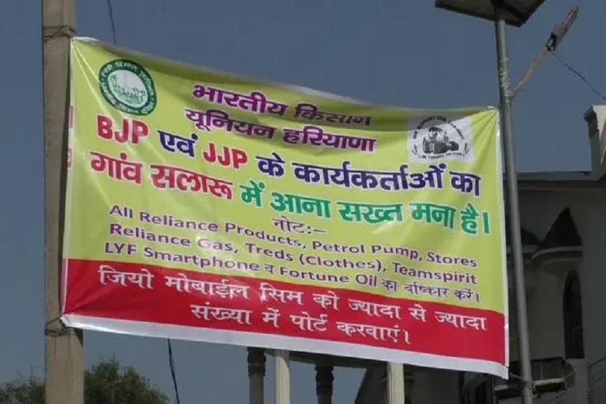 നേതാക്കള് ഗ്രാമത്തിലേക്ക് പ്രവേശിച്ചാല് ഉണ്ടാകുന്ന പ്രത്യാഘാതങ്ങള്ക്ക് ഉത്തരവാദികള് ആയിരിക്കില്ല എന്നും ബോര്ഡില് പറയുന്നു. ഒപ്പം എല്ലാ റിലയന്സ് ഉല്പന്നങ്ങളും പെട്രോള് പമ്പുകളും കൂടാതെ റിലയന്സ് ഗ്യാസ്, ട്രെന്ഡ്സ്, ടീംസ്പിരിറ്റ്, ലൈഫ് സ്മാര്ട്ട് ഫോണ്, ഫോര്ച്യൂണ് ഓയില് എന്നിവയും ബഹിഷ്കരിക്കണമെന്ന് ആഹ്വാനം ചെയ്യുന്നുണ്ട്. കര്ഷക സമരങ്ങള്ക്ക് പിന്തുണ അറിയിച്ചാണ് ബാനറുകള് ഉയര്ന്നിട്ടുള്ളത്.