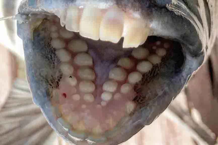 വായ് നിറച്ചും പല്ലുള്ള മീനിനെ കണ്ടിട്ടുണ്ടോ? ചിലരെല്ലാം കണ്ടുകാണാൻ വഴിയുണ്ട്. എന്തായാലും ഈ മീൻ ഇപ്പോൾ സോഷ്യൽ മീഡിയയിൽ വൈറലാണ്. അമേരിക്കയിലെ നോർത്ത് കരോലിനയിലെ മീൻ പിടുത്ത കേന്ദ്രമായ നാഗ്സ് ഹെഡിൽ നിന്നും പിടിച്ച മീനാണ് ഇപ്പോൾ സമൂഹ മാദ്ധ്യമങ്ങളിൽ പലരെയും അൽഭുതപ്പെടുത്തുന്നത്.