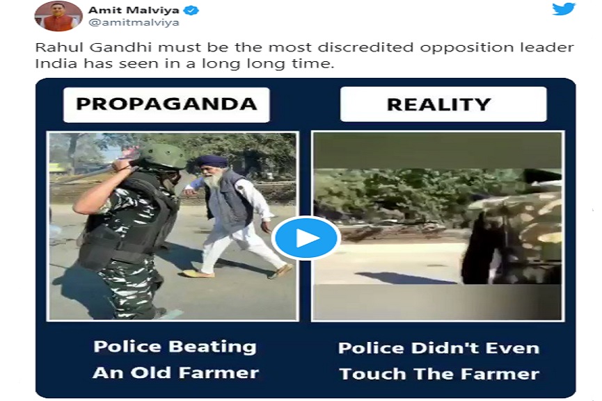ഈ വീഡിയോ സൃഷ്ടിക്കുന്ന കർഷക അനുകൂല തരംഗം പ്രതിരോധിക്കേണ്ട ബാധ്യത ബിജെപിയുടെ ഐടി സെല്ലിന്റെ ചുമതലയിൽ വന്നു ചേർന്നു. അതനുസരിച്ച് ‘മുതിർന്ന പൗരനായ കർഷകനെ അടിക്കുന്നില്ല’ എന്ന് വരുത്തിതീർക്കാൻ അത്രയെളുപ്പം സാധരണക്കാർക്ക് തിരിച്ചറിയാൻ സാധിക്കാത്ത മുറിച്ചുമാറ്റലും കൂട്ടിചേർക്കലും നടത്തിയ ഒരു വീഡിയോ ബിജെപി ഐടിസെൽ ദേശീയ മേധാവി അമിത് മാളവ്യ സാമൂഹിക മാദ്ധ്യമങ്ങളിലൂടെ പങ്കുവെക്കുകയും ചെയ്തു.