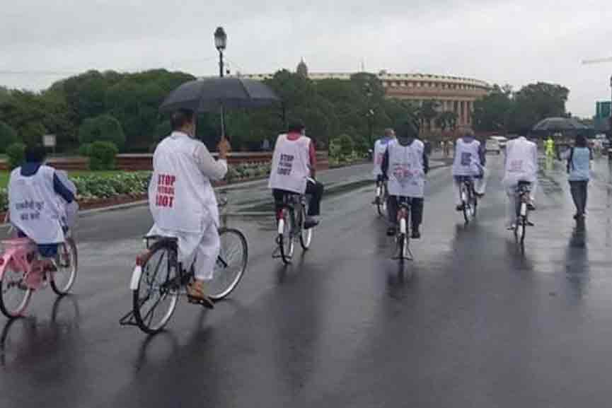 ന്യൂഡെൽഹിൽ: രാജ്യത്ത് ദിനപ്രതിയെന്നോണം കുതിച്ചുയരുന്ന ഇന്ധനവില വര്ധനവിൽ പ്രതിഷേധിച്ച് പാർലമെന്റിലേക്ക് സൈക്കിളിൽ എത്തി തൃണമൂൽ എംപിമാർ. പാര്ലമെന്റ് മണ്സൂണ് സെഷന് ആരംഭിക്കുന്ന ആദ്യ ദിവസമായ ഇന്ന് സൈക്കിളിൽ പ്രതിഷേധ സൂചകമായി പ്ളക്കാര്ഡുകള് വെച്ചുകൊണ്ടാണ് ഇവര് പാര്ലമെന്റിലേക്ക് എത്തിയത്.