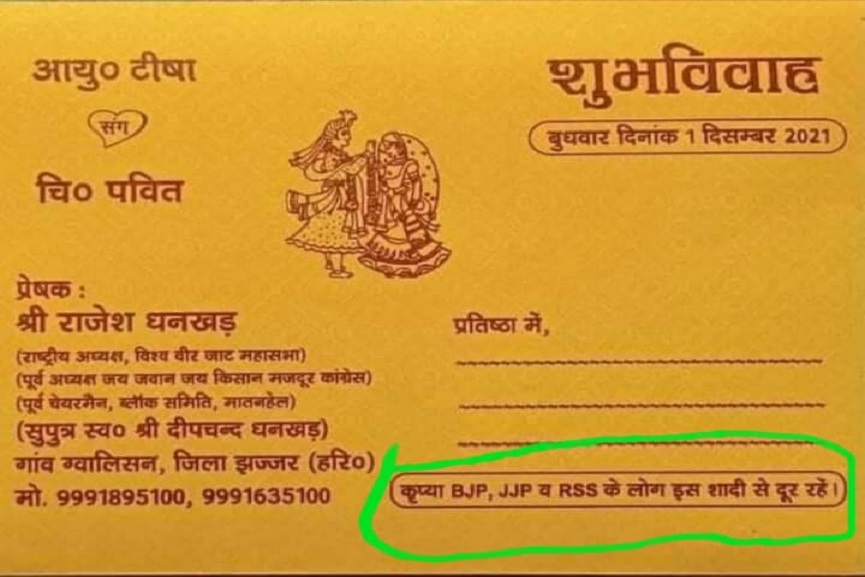 ചണ്ഡീഗഡ്: തന്റെ മകളുടെ വിവാഹത്തിന് ബിജെപി, ആര്എസ്എസ്, ജെജപി പ്രവർത്തകർ പങ്കെടുക്കരുതെന്ന് അഭ്യര്ത്ഥിച്ച് പിതാവ്. ഹരിയാനയിലാണ് സംഭവം. വിശ്വവീര് ജാട്ട് മഹാസഭ ദേശീയ പ്രസിഡണ്ടും ജയ് ജവാന് ജയ് കിസാന് മസ്ദൂര് കോണ്ഗ്രസ് മുന് അധ്യക്ഷനുമായ രാജേഷ് ധങ്കാര് ആണ് മകളുടെ വിവാഹത്തിന് വ്യത്യസ്തമായ ക്ഷണക്കത്ത് തയ്യാറാക്കിയത്.