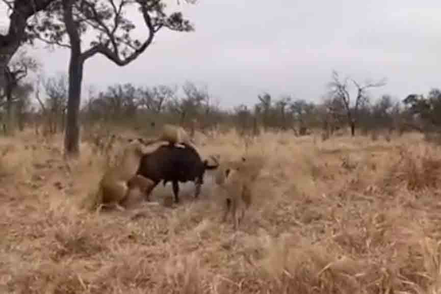 കാട്ടിൽ മേയുകയായിരുന്ന കാട്ടുപോത്തിനെ വളഞ്ഞിട്ട് ആക്രമിച്ച് സിംഹക്കൂട്ടം. കാട്ടുപോത്തിനെ രക്ഷപെടാൻ സമ്മതിക്കാതെ അതിന്റെ പുറത്തു കയറിയും ചുറ്റും നിന്നും കടിക്കാൻ ശ്രമിക്കുകയായിരുന്നു സിംഹങ്ങൾ. എന്നാൽ ആപത്തിൽപെട്ട സുഹൃത്തിനെ രക്ഷിക്കാൻ മറ്റൊരു കാട്ടുപോത്ത് കുതിച്ചുപാഞ്ഞ് എത്തി.