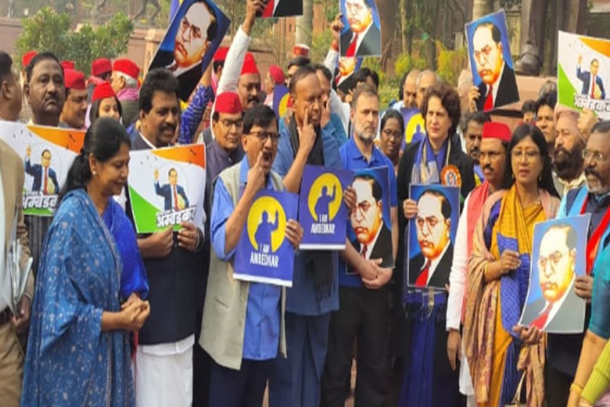ദലിത് സമരങ്ങളുടെ പ്രതീകമായാണ് നീല നിറത്തിലുള്ള വസ്ത്രം ധരിച്ചത്. ഇന്ന് കോൺഗ്രസ് പിസിസികളുടെ നേതൃത്വത്തിൽ രാജ്യവ്യാപക പ്രതിഷേധത്തിന് ആഹ്വാനം ചെയ്തിട്ടുണ്ട്. രാഹുൽ ഗാന്ധിയുടെയും പ്രിയങ്ക ഗാന്ധിയുടെയും നേതൃത്വത്തിലാണ് പാർലമെന്റിലേക്ക് പ്രതിഷേധ മാർച്ച് സംഘടിപ്പിച്ചത്. എൻഡിഎ-ഇന്ത്യ സഖ്യ എംപിമാർ നേർക്കുനേർ നിന്ന് മുദ്രാവാക്യം മുഴക്കിയതോടെ പാർലമെന്റ് വളപ്പിൽ സംഘർഷാന്തരീക്ഷം ഉണ്ടായി.