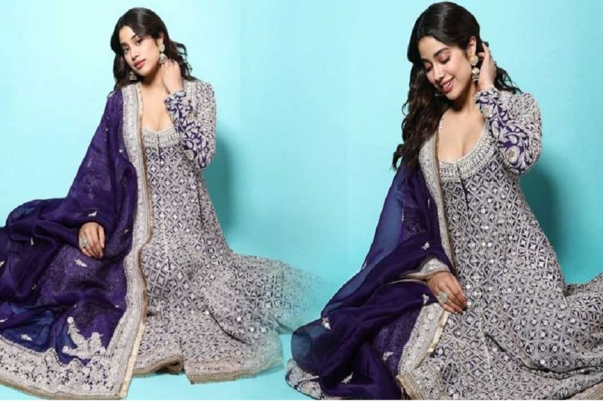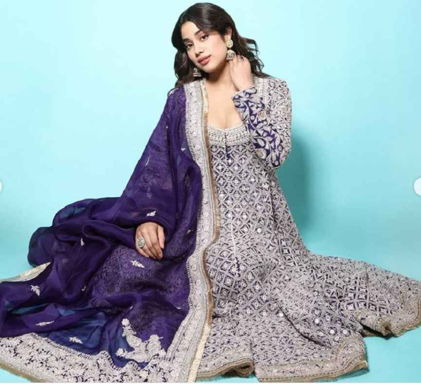 സിൽവർ മോട്ടീഫ്സുള്ള വയലറ്റ് ഓർഗൻസ ദുപ്പട്ടയാണ് ജാൻവി പെയർ ചെയ്തിരിക്കുന്നത്. ബോർഡറിൽ മെറ്റാലികും അഴക് ഇരട്ടിയാക്കുന്നു.
