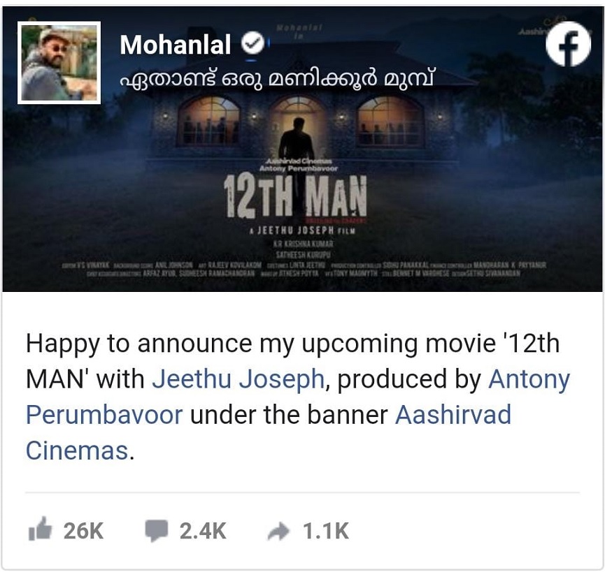 ആശിർവാദ് സിനിമാസിന്റെ ബാനറിൽ ആന്റണി പെരുമ്പാവൂർ നിർമിക്കുന്ന ഈ ചിത്രം ഒരു വീട്ടിൽ നടക്കുന്ന കഥയാണ് പറയുന്നത്. ‘ട്വെൽത് മാൻ’ ഒരു മിസ്റ്ററി ത്രില്ലർ ആണെന്നാണ് റിപ്പോർട്ടുകൾ.