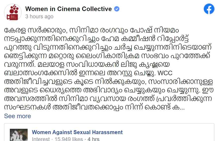 കേരള സർക്കാരും, സിനിമാ രംഗവും പോഷ് നിയമം നടപ്പാക്കുന്നതിനെക്കുറിച്ചും ഹേമ കമ്മീഷൻ റിപ്പോർട് പുറത്തു വിടുന്നതിനെക്കുറിച്ചും ചർച്ച ചെയ്യുന്നതിനിടെയാണ് ഞെട്ടിക്കുന്ന മറ്റൊരു ലൈംഗികാതിക്രമ സംഭവം പുറത്തേക്ക് വരുന്നത്. മലയാള സംവിധായകൻ ലിജു കൃഷ്ണയെ ബലാൽസംഗക്കേസിൽ ഇന്നലെ അറസ്റ്റ് ചെയ്തു. ഡബ്ള്യുസിസി അതിജീവിച്ചവളുടെ കൂടെ നിൽക്കുകയും, സംസാരിക്കാനുള്ള അവളുടെ ധൈര്യത്തെ അഭിവാദ്യം ചെയ്യുകയും ചെയ്യുന്നു. ഈ അവസരത്തിൽ സിനിമാ വ്യവസായ രംഗത്ത് പ്രവർത്തിക്കുന്ന സംഘടനകൾ അതിജീവതക്കൊപ്പം നിന്ന് കൊണ്ട് കൈകൊള്ളേണ്ട അടിയന്തിര നടപടികളിലേക്ക് ശ്രദ്ധ ക്ഷണിക്കുന്നു.