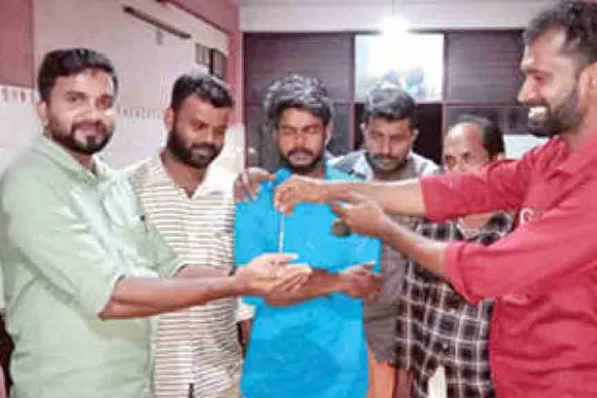 കളഞ്ഞുകിട്ടിയ സ്വർണാഭരണം യുവാക്കൾ ഉടമയായ വലിയ തയ്യിൽ ബിനീഷിന് കൈമാറുന്നു