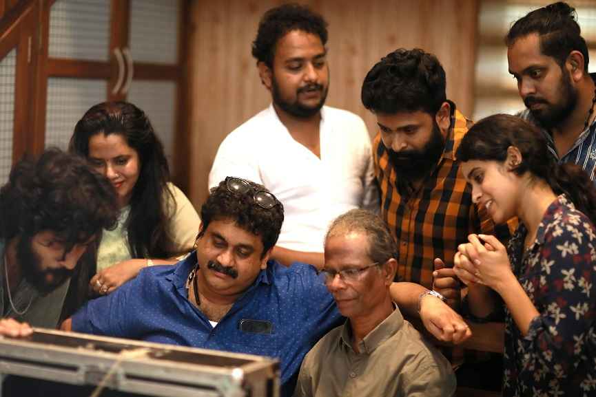 ഇന്ദ്രൻസ്, എക്‌സിക്യൂട്ടീവ് പ്രൊഡ്യൂസർ എൻഎം ബാദുഷ എന്നിവർ ‘മെയ്‌ഡ്‌ ഇന്‍ ക്യാരവാന്‍’ ചിത്രീകരണ സംഘത്തിനൊപ്പം