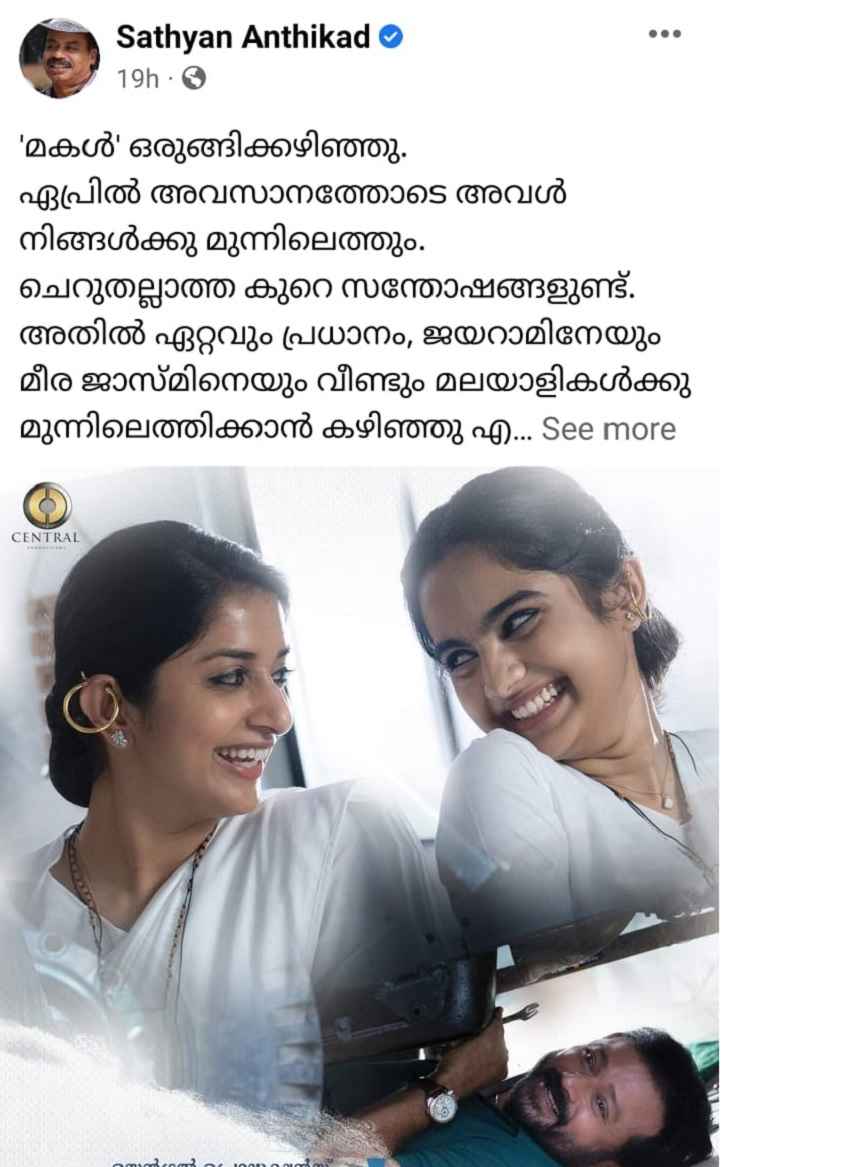 മീര ജാസ്മിൻ, ജയറാം എന്നിവർ ഒന്നിക്കുന്ന ‘മകൾ’ സിനിമയുടെ ആദ്യടീസര് പുറത്തുവിട്ട് സംവിധായകന് സത്യന് അന്തിക്കാട്. ഏപ്രിൽ അവസാനത്തോടെ ചിത്രമെത്തുമെന്ന് ഫേസ്ബുക്ക് കുറിപ്പില് സംവിധായകന് അറിയിച്ചു.
