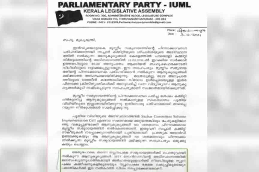 ന്യൂനപക്ഷ സമുദായങ്ങള്ക്ക് പൊതുവായി നല്കുന്ന ആനുകൂല്യങ്ങള് 2021ലെ സെന്സസിന്റെ അടിസ്ഥാനത്തില് ജനസംഖ്യാനുപാതമായി നിലവിലുള്ള ന്യൂനപക്ഷ കമ്മീഷനുകളിലൂടെയും ന്യൂനപക്ഷ ക്ഷേമ വകുപ്പുകളിലൂടെയും പരാതികള്ക്ക് ഇട നല്കാത്ത വിധം നടപ്പാക്കേണ്ടതാണ് എന്നും കത്തിൽ പറയുന്നു.