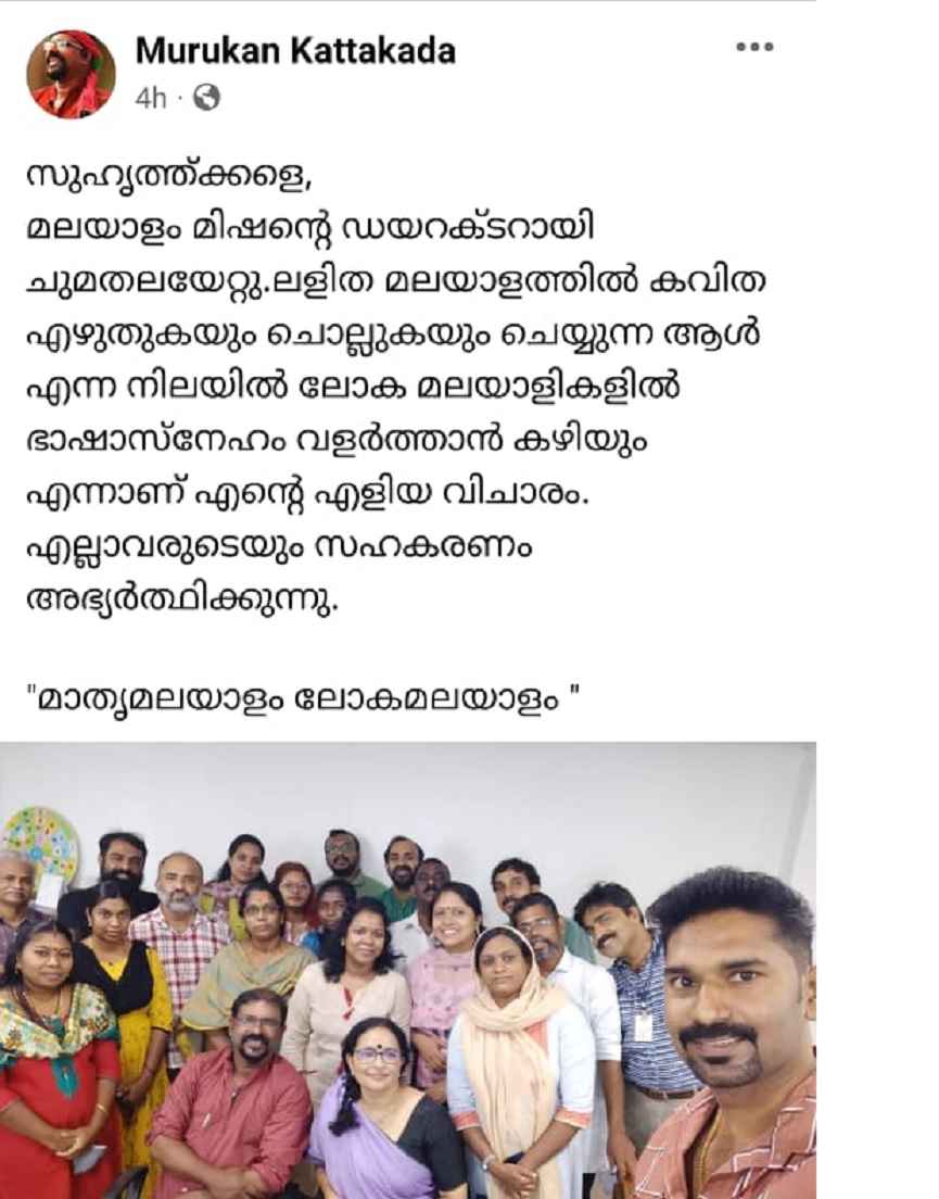 തിരുവനന്തപുരം: മലയാളം മിഷന്റെ പുതിയ ഡയറക്ടറായി പ്രശസ്ത കവി മുരുകൻ കാട്ടാക്കട ചുമതലയേറ്റു. തിരുവനന്തപുരത്തെ തൈക്കാടുള്ള ആസ്ഥാന ഓഫിസിലെത്തിയാണ് ചുമതലയേറ്റത്.