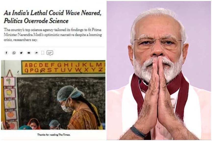 ‘ഇന്ത്യയില് മാരകമായ കോവിഡ് തരംഗം അടുക്കുമ്പോള്, രാഷ്ട്രീയം ശാസ്ത്രത്തെ മറികടക്കുന്നു’ എന്ന തലക്കെട്ടിലായിരുന്നു ന്യൂയോര്ക് ടൈംസില് വാര്ത്ത വന്നത്. ഇന്ത്യന് കൗണ്സില് ഓഫ് മെഡിക്കല് റിസര്ച്ചിന്റെ ഉദ്യോഗസ്ഥര് പ്രധാനമന്ത്രി നരേന്ദ്ര മോദിയുടെ ‘രാഷ്ട്രീയ ലക്ഷ്യങ്ങള്ക്ക്’ മുന്ഗണന നല്കാനും കൊറോണ വൈറസ് ഭീഷണിയെ നിസാരമായി കാണാനും നിര്ബന്ധിതരായെന്നാണ് വാർത്തയിൽ പറഞ്ഞത്.