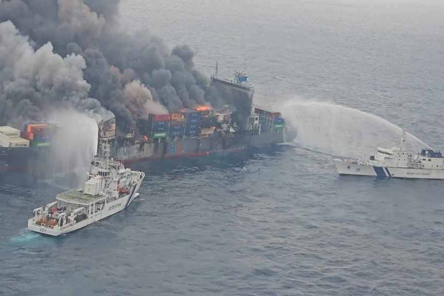 അതേസമയം, കപ്പലിലെ തീ രണ്ടുദിവസം പിന്നിട്ടിട്ടും പൂർണമായി നിയന്ത്രണവിധേയമാക്കാൻ കഴിഞ്ഞിട്ടില്ലെന്നാണ് കോസ്റ്റ് ഗാർഡ് നൽകുന്ന വിവരം. ഏകദേശം 10 മുതൽ 15 ഡിഗ്രിവരെ കപ്പൽ ചെരിഞ്ഞിട്ടുണ്ടെന്നും കോസ്റ്റ് ഗാർഡ് വ്യക്തമാക്കുന്നു. എങ്കിലും കപ്പൽ സന്തുലിതാവസ്ഥയിൽ നിലകൊള്ളുന്നുണ്ട്. കനത്ത മഴകാരണം രാവിലെമുതൽ ഉച്ചവരെ കോസ്റ്റ് ഗാർഡിന്റെ വിമാനത്തിന് രക്ഷാപ്രവർത്തനത്തിൽ പങ്കെടുക്കാൻ കഴിഞ്ഞിരുന്നില്ല.