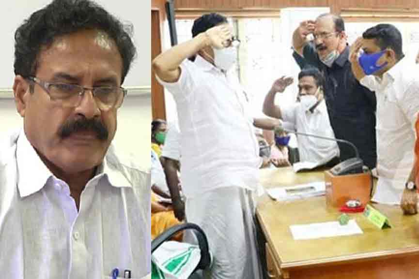 തൃശൂർ: പോലീസ് ഉദ്യോഗസ്ഥർ സല്യൂട്ട് നല്കുന്നില്ലെന്ന പരാതി ഉന്നയിച്ച തൃശൂർ മേയര് എംകെ വര്ഗീസിന് സല്യൂട്ട് നല്കി പ്രതിപക്ഷ അംഗങ്ങളുടെ പരിഹാസം. ഇന്നലെ ചേര്ന്ന കോര്പറേഷന് കൗണ്സില് ഹാളില് നടന്ന ചര്ച്ചക്കിടെയാണ് സംഭവം.