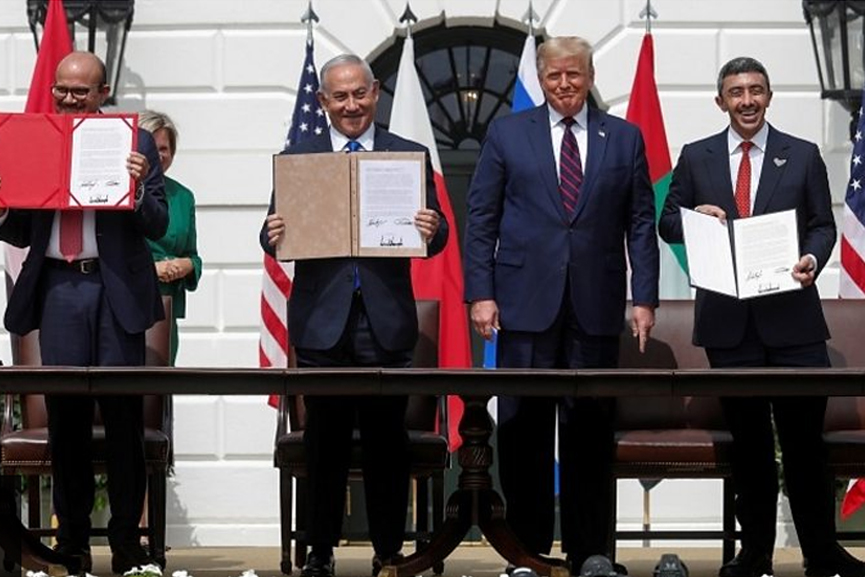 വാഷിംഗ്ടൺ: ഇസ്രയേലുമായി യുഎഇയും ബഹ്റൈനും സമാധാന കരാറിൽ ഒപ്പുവച്ചു. യുഎസ് പ്രസിഡന്റ് ഡൊണാൾഡ് ട്രംപിന്റെ മധ്യസ്ഥതയിൽ വൈറ്റ് ഹൗസിലായിരുന്നു ചരിത്ര മുഹൂർത്തം. ഇസ്രയേൽ പ്രധാനമന്ത്രി ബെന്യാമിൻ നെതന്യാഹു, യു.എ.ഇ വിദേശകാര്യമന്ത്രി ഷെയ്ഖ് അബ്ദുല്ല ബിൻ സയിദ് അൽ നഹ്യാൻ, ബഹ്റൈൻ വിദേശകാര്യമന്ത്രി അബ്ദുൽ ലത്തീഫ് അൽ സയാനി എന്നിവരാണ് കരാറിൽ ഒപ്പുവച്ചത്.