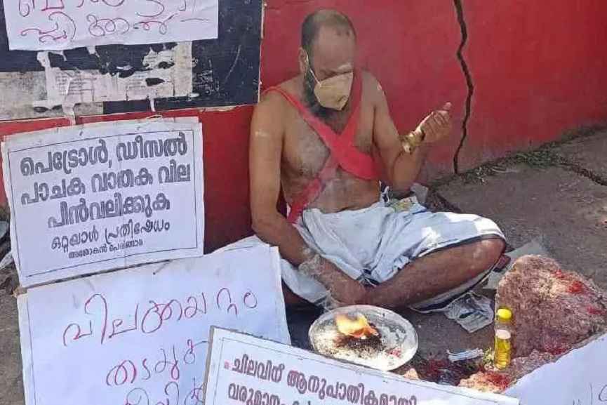 കാസർഗോഡ്: ഇന്ധനവില വർധിപ്പിച്ച് ജനങ്ങളെ ദ്രോഹിക്കുന്ന പ്രധാനമന്ത്രിയിൽ കുടിയിരിക്കുന്ന ബാധ ഒഴിപ്പിക്കാൻ ദേശീയ പാതയോരത്ത് പ്രത്യേക ‘പൂജ’. ചെകുത്താൻ കൂടാതെ ഒരു പ്രധാനമന്ത്രിക്ക് ഇങ്ങനെ ജനത്തെ ദ്രോഹിക്കാൻ കഴിയില്ലെന്ന് ചൂണ്ടിക്കാട്ടിയാണ് അശോകൻ പെരിങ്ങാരയുടെ ‘പൂജ’ സമരം.