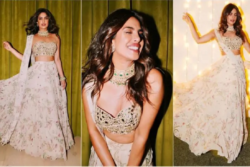 ഫ്ളോറൽ പ്രിന്റ് ലെഹംഗയും ഫ്ളോറൽ മിററർ ബ്ളൗസുമാണ് താരം ധരിച്ചിരിക്കുന്നത്. കഴുത്തുനിറഞ്ഞു കിടക്കുന്ന ചോക്കറും പരമ്പരാഗത ശൈലിയിലുള്ള കമ്മലുമെല്ലാം പ്രിയങ്കയുടെ ട്രഡീഷണൽ ലുക്കിന് ഏറെ ഇണങ്ങുന്നതാണ്. കൂടാതെ മുടി വിടർത്തിയിട്ടതും മിനിമൽ മേക്കപ്പും താരത്തെ കൂടുതൽ മനോഹരിയാക്കുന്നു.