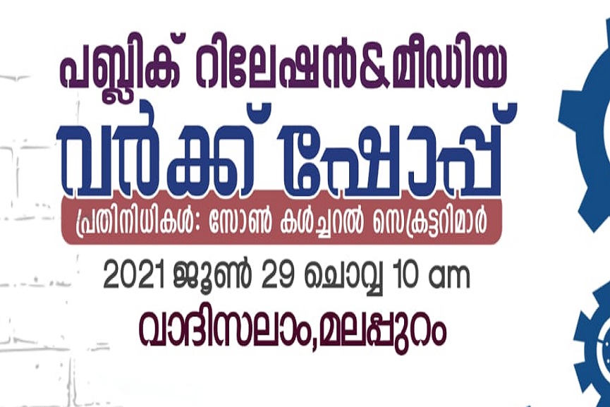 മലപ്പുറം: കേരള മുസ്ലിം ജമാഅത്ത് ജില്ലാ കമ്മിറ്റി സോൺ കൾച്ചറൽ സെക്രട്ടറിമാർക്കായി സംഘടിപ്പിക്കുന്ന പബ്ളിക് റിലേഷൻ, മീഡിയ വർക്ക് ഷോപ്പ് 2021 ജൂൺ 29 ചൊവ്വ, നാളെ കാലത്ത് പത്ത്മണിക്ക് മലപ്പുറം വാദിസലാമിൽ നടക്കും.