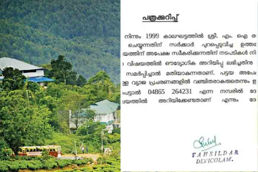ഇടുക്കി: രവീന്ദ്രൻ പട്ടയങ്ങൾക്കുള്ള പുതിയ അപേക്ഷ സ്വീകരിച്ചു തുടങ്ങിയിട്ടില്ലെന്ന് ദേവികുളം തഹസിൽദാരുടെ അറിയിപ്പ്. ഔദ്യോഗിക അറിയിപ്പ് ലഭിച്ചതിന് ശേഷം അപേക്ഷ സമർപ്പിച്ചാൽ മതിയെന്നും പട്ടയ അപേക്ഷ സംബന്ധിച്ച വ്യാജ പ്രചാരണങ്ങളിൽ വഞ്ചിതരാകരുത് എന്നും തഹസിൽദാർ പറഞ്ഞു.