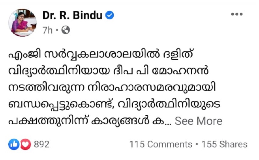 തിരുവനന്തപുരം: മഹാത്മാ ഗാന്ധി സർവകലാശാലയിൽ സമരം നടത്തുന്ന ദളിത് വിദ്യാർഥിനി ദീപ പി മോഹനന് പിന്തുണ അറിയിച്ച് ഉന്നത വിദ്യാഭ്യാസമന്ത്രി ഡോ. ആർ ബിന്ദു. ആരോപണ വിധേയനായ അധ്യാപകനെ പദവിയിൽനിന്ന് മാറ്റിനിർത്തി പരാതി അന്വേഷിക്കാൻ സർവകലാശാലയ്ക്ക് നിർദ്ദേശം നൽകിയിട്ടുണ്ടെന്നും അതിന് സാങ്കേതിക തടസമുണ്ടെങ്കിൽ അതിനാധാരമായ രേഖകൾ എന്തെല്ലാമാണെന്ന് അറിയിക്കാൻ ആവശ്യപ്പെട്ടിട്ടുണ്ടെന്നും മന്ത്രി അറിയിച്ചു. ഫേസ്ബുക്കിൽ പങ്കുവെച്ച കുറിപ്പിലാണ് മന്ത്രി നിലപാട് വ്യക്തമാക്കിയത്.