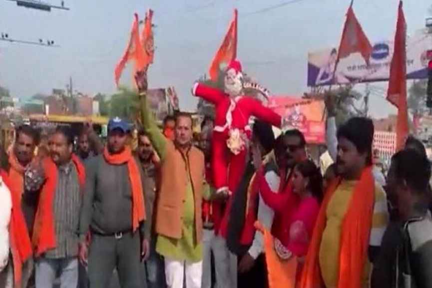 ആഗ്ര: ക്രിസ്തുമസ് ആഘോഷങ്ങൾ വഴി മതപരിവർത്തനം നടത്താനുള്ള അവസരം ഒരുക്കുന്നുവെന്ന് ആരോപിച്ച് ആഗ്രയിൽ രാഷ്ട്രീയ ബജ്രംഗ്ദൾ അടക്കമുള്ള ഹിന്ദുത്വ സംഘടനകളുടെ നേതൃത്വത്തിൽ സാന്താക്ളോസിന്റെ കോലം കത്തിച്ചു. ആഗ്ര മഹാത്മാ ഗാന്ധി മാർഗിലെ സെൻറ് ജോൺസ് കോളേജിനു സമീപമാണ് സംഭവം.