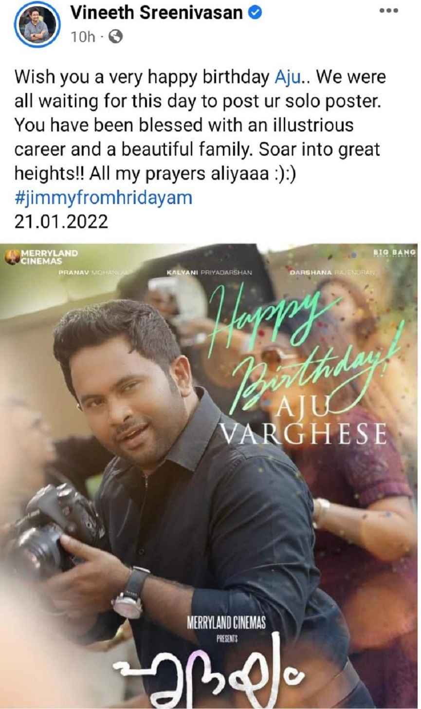 ‘അജുവിന് സന്തോഷം നിറഞ്ഞ പിറന്നാൾ ആശംസിക്കുന്നു. നിന്റെ സോളോ പോസ്റ്റർ ഇറക്കുന്നതിനായി ഈ ഒരു ദിനത്തിനായി കാത്തിരിക്കുകയായിരുന്നു’, വിനീത് ശ്രീനിവാസൻ പോസ്റ്റർ പങ്കുവെച്ചുകൊണ്ട് കുറിച്ചു.