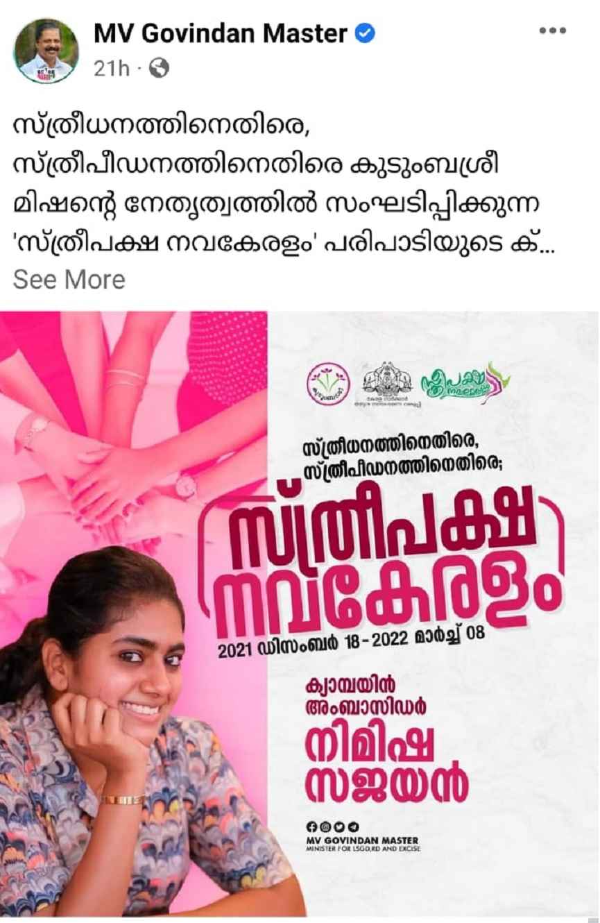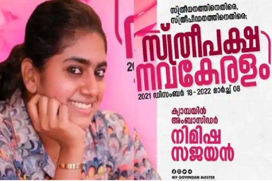 സ്ത്രീധനത്തിനെതിരെ, സ്ത്രീപീഡനത്തിനെതിരെ കുടുംബശ്രീ മിഷന്റെ നേതൃത്വത്തില് സംഘടിപ്പിക്കുന്ന ‘സ്ത്രീപക്ഷ നവകേരളം’ പരിപാടിയുടെ ക്യാംപയിന് അംബാസഡറാകുന്നത് മലയാളത്തിന്റെ പ്രിയ അഭിനേത്രി നിമിഷ സജയനാണ്.
