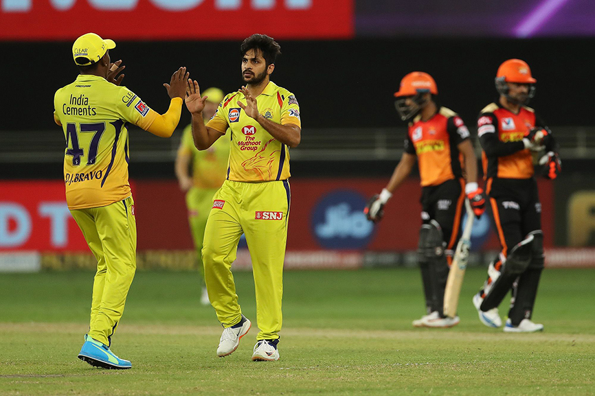 13 പന്തില് ഒമ്പതു റണ്സുമായി നിന്ന ഡേവിഡ് വാര്ണറെ പുറത്താക്കി സാം കറന് വിക്കറ്റ് വേട്ടക്ക് തുടക്കം കുറിച്ചു. നാലാം ഓവറിലെ മൂന്നാം പന്തില് റിട്ടേണ് ക്യാച്ചിലൂടെ വാര്ണറെ പുറത്താക്കുമ്പോള് എസ്ആര്എച്ച് സ്കോര് 23 റണ്സ് മാത്രമായിരുന്നു. നാലാം ഓവറിലെ അവസാന പന്തില് ഇല്ലാത്ത റണ്ണെടുക്കാന് ശ്രമിച്ച മനീഷ് പാണ്ഡെയെ നേരിട്ടുള്ള ത്രോയില് റണ്ണൗട്ടാക്കി ബ്രാവോ ചെന്നൈക്ക് മുന്തൂക്കം നല്കി.