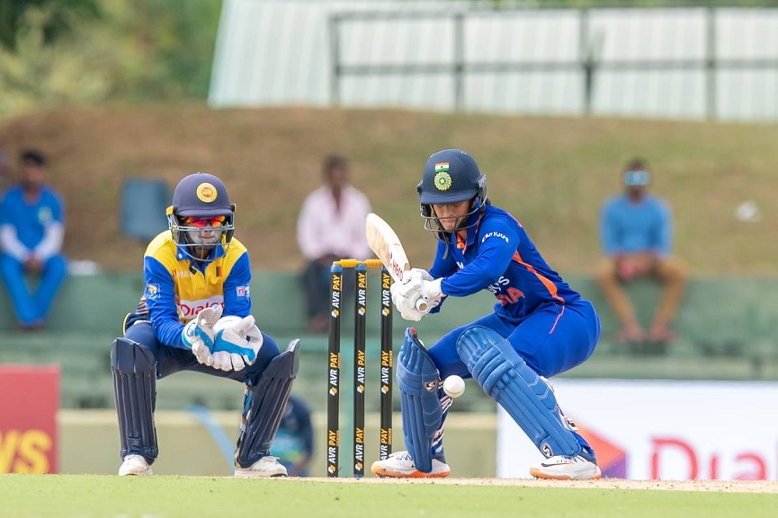 ആദ്യ ഓവറിൽ തന്നെ ഇന്ത്യയുടെ ഷഫാലി വർമ (5) പുറത്തായി. കൃത്യമായ ലൈനുകളിൽ പന്തെറിഞ്ഞ് ഇന്ത്യയെ പിടിച്ചുകെട്ടിയ ശ്രീലങ്ക തുടക്കത്തിൽ ഫീൽഡിംഗിലും മികച്ചുനിന്നു. രണ്ടാം വിക്കറ്റിൽ സ്മൃതിയും സബ്ബിനേനി മേഘ്നയും ചേർന്ന് 41 റൺസിന്റെ കൂട്ടുകെട്ട് ഉയർത്തിയെങ്കിലും റൺ നിരക്ക് വളരെ കുറവായിരുന്നു. പിന്നാലെ മന്ദന (22)യും മേഘ്നയും (22) പുറത്തായി.