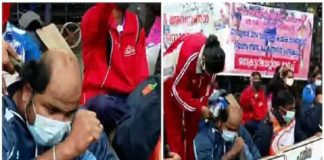 അർഹമായ ജോലി നൽകണം, തലമുണ്ഡനം ചെയ്ത് കായിക താരങ്ങൾ; പ്രതിഷേധം